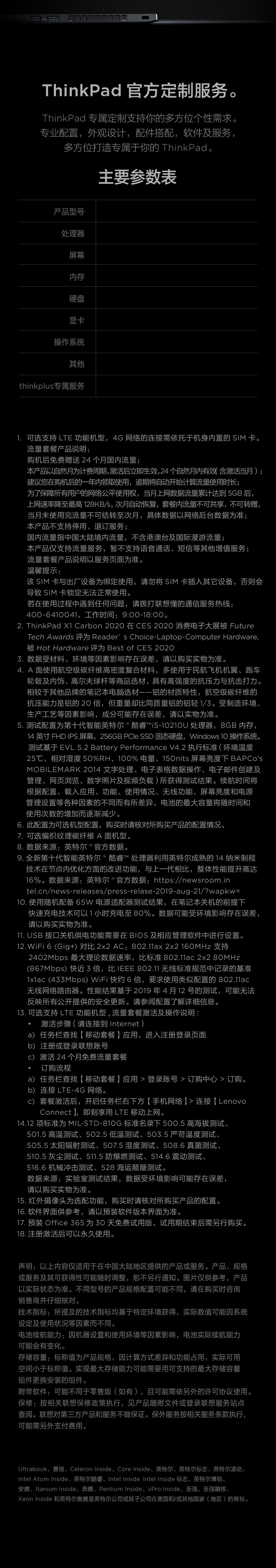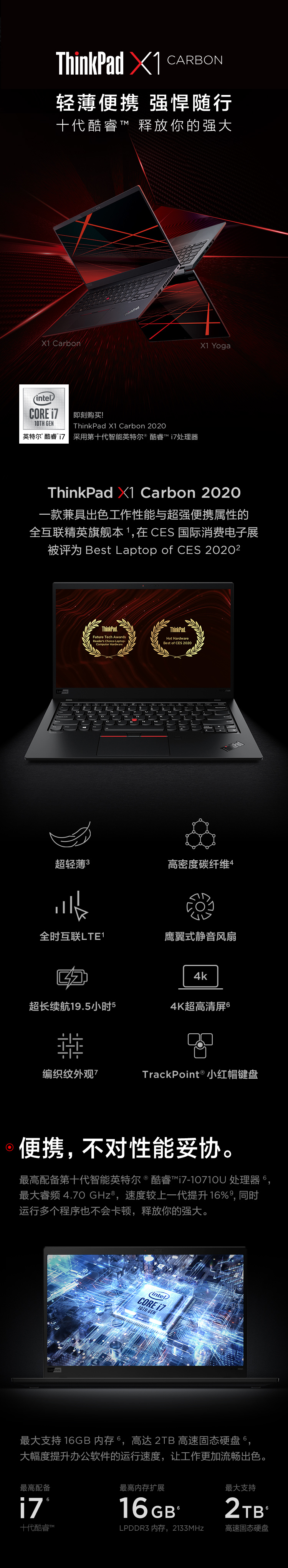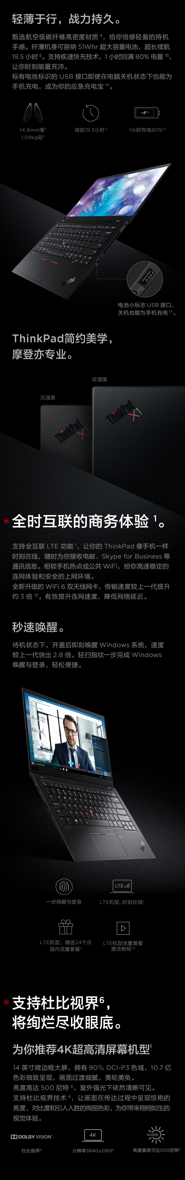 联想ThinkPad X1 Carbon 2020 7HCD 英特尔酷睿i7 14英寸轻薄笔记本电脑 十代i7 16G 512G WQHD 4G版 沉浸黑