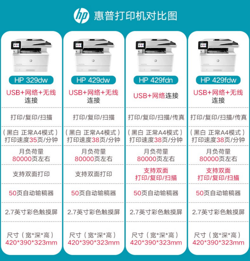 惠普(HP)黑白激光一体机M429dw/fdw 329dw打印机多功能自动双面复印扫描无线 M429fdw【四合一+自动双面打印+无线连接】 官方标配
