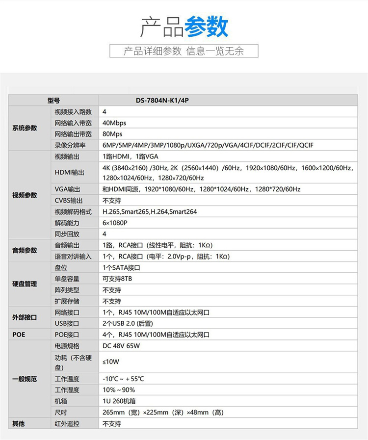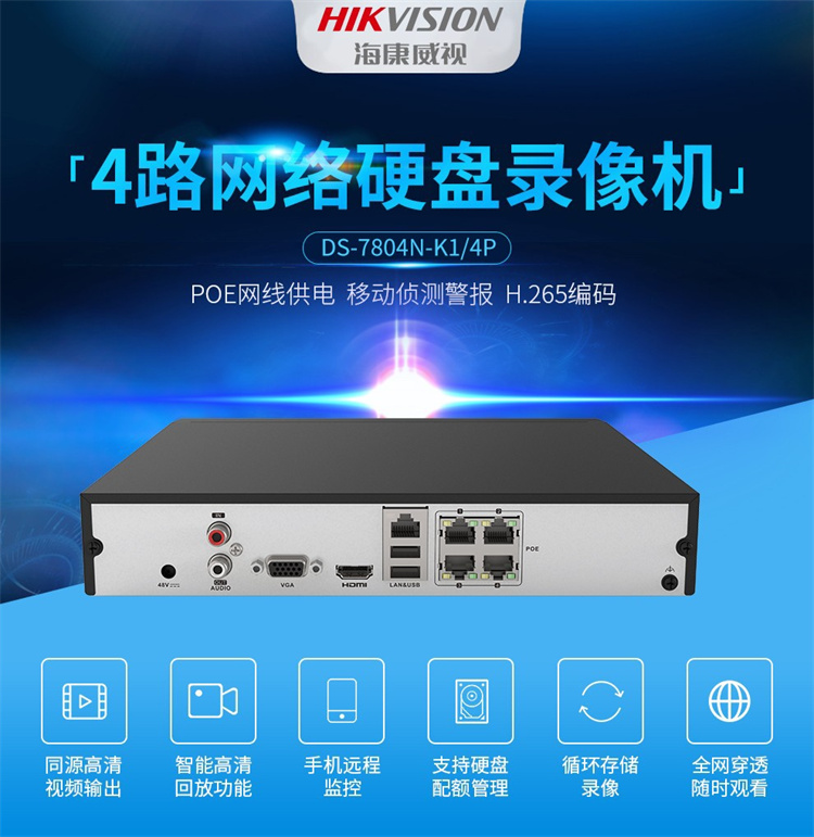 海康威视 DS-7804N-K1/4P 海康威视网络监控硬盘录像机4路POE网口 不带硬盘